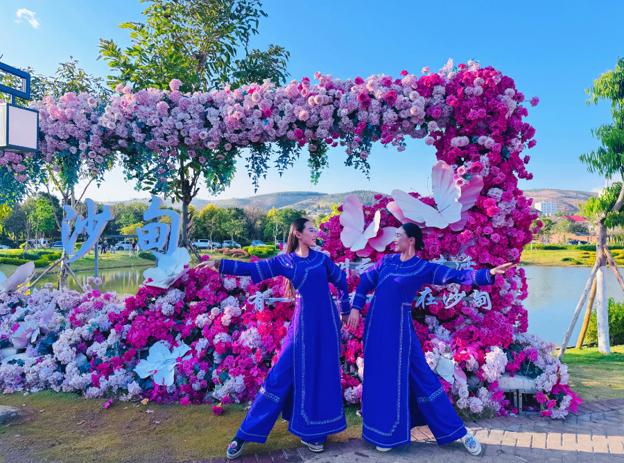 杨钰尼和家人打卡沙甸鲜花墙(2月21日摄)。供图