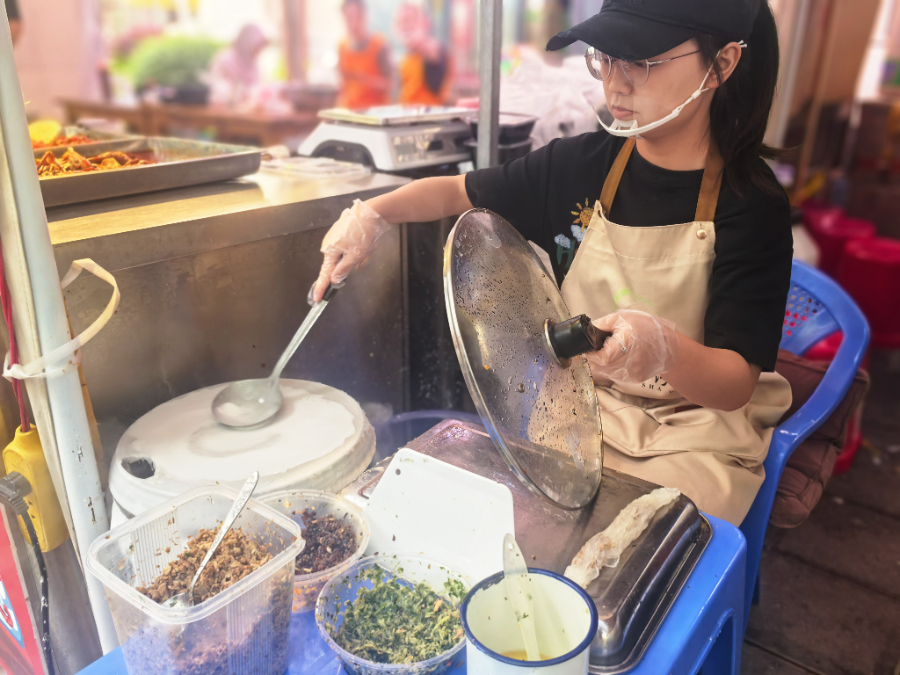 “米浆和馅儿都是我们自己准备的,各种馅料卷在一起。”小婧说。在她看来,美食街不仅是家门口的“大集市”,更是一个巨大的“融合器”,将天南地北的人聚在一起,品出幸福滋味。
