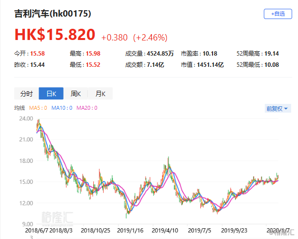 受消息影响,今日开盘后吉利汽车股价小幅高开,截至最新暂报15.82港元,涨2.46%,成交7.14亿,最新总市值1451.14亿港元。去年年初至今,吉利汽车股价累计涨幅为17.8%。