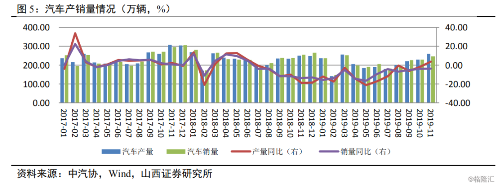 全行业而言,去年下半年以来,汽车库存情况已显着好转,目前已恢复至较为合理区间。而行业产销数据方面,虽然同比增幅仍维持负增长,但跌幅已经有所收窄。按截至去年11月份数据,行业产量同比增速从年初的-12.05%回升至3.80%,销量同比降幅从年初15.76%收窄至3.57%。
