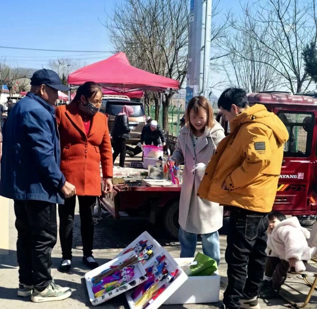 集市上人头攒动,摊位前,红的、粉的、黄的疳娃娃挤挤挨挨,在阳光下招摇;檐下挂着的,风一吹就轻轻晃,像是在跟行人打招唿。摊主扯着嗓子吆喝:“这个寓意好,给娃娃带回去,保一年顺顺当当!”乡亲们你一言我一语,挑着、比着、笑着,讨价还价里全是熟络的乡音。
